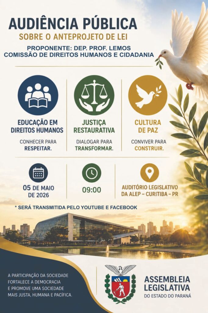 05/maio 9h pelo You Tube – Audiência Pública ALP Assembleia Legislativa do Estado do Paraná: – Institui a Política Estadual de Educação em Direitos Humanos, Cultura de Paz e Justiça Restaurativa no Estado do Paraná e dá outras providências.