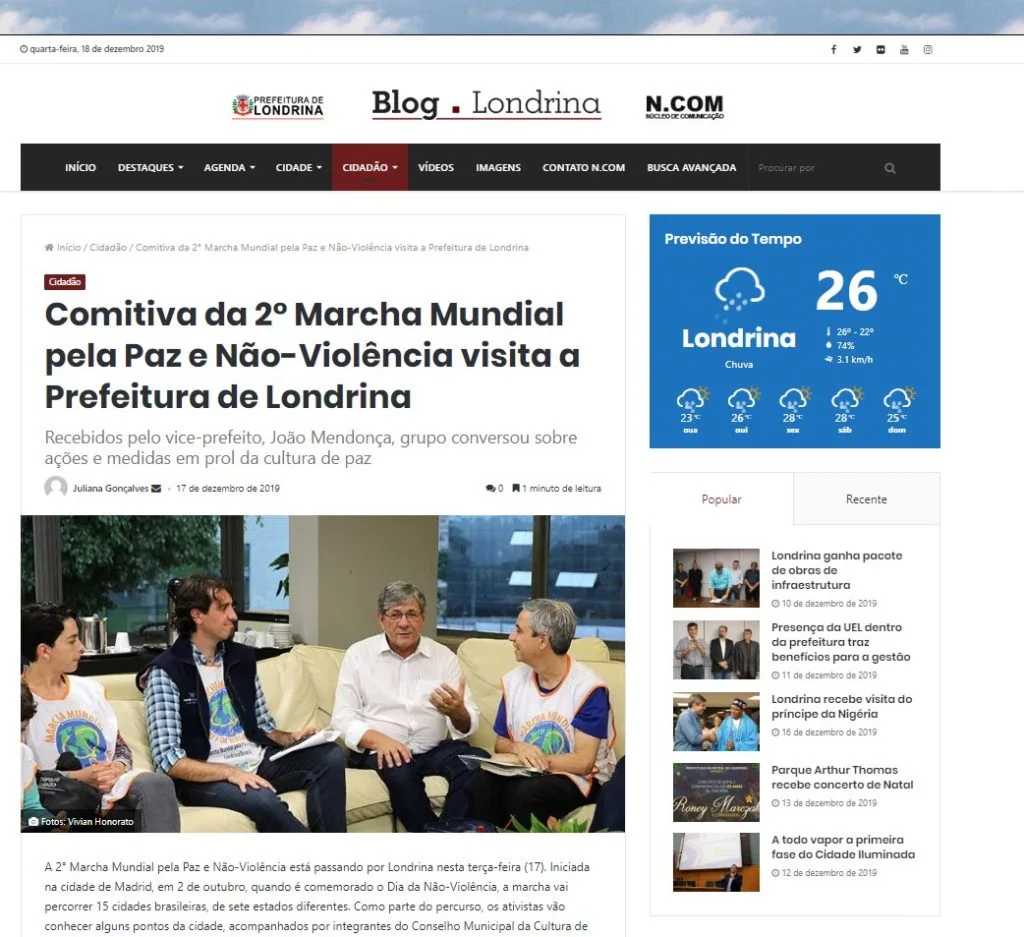 A 2° Marcha Mundial pela Paz e Não-Violência está passando por Londrina nesta terça-feira (17). Iniciada na cidade de Madrid, em 2 de outubro, quando é comemorado o Dia da Não-Violência, a marcha vai percorrer 15 cidades brasileiras, de sete estados diferentes. Como parte do percurso, os ativistas vão conhecer alguns pontos da cidade, acompanhados por integrantes do Conselho Municipal da Cultura de Paz (COMPAZ).