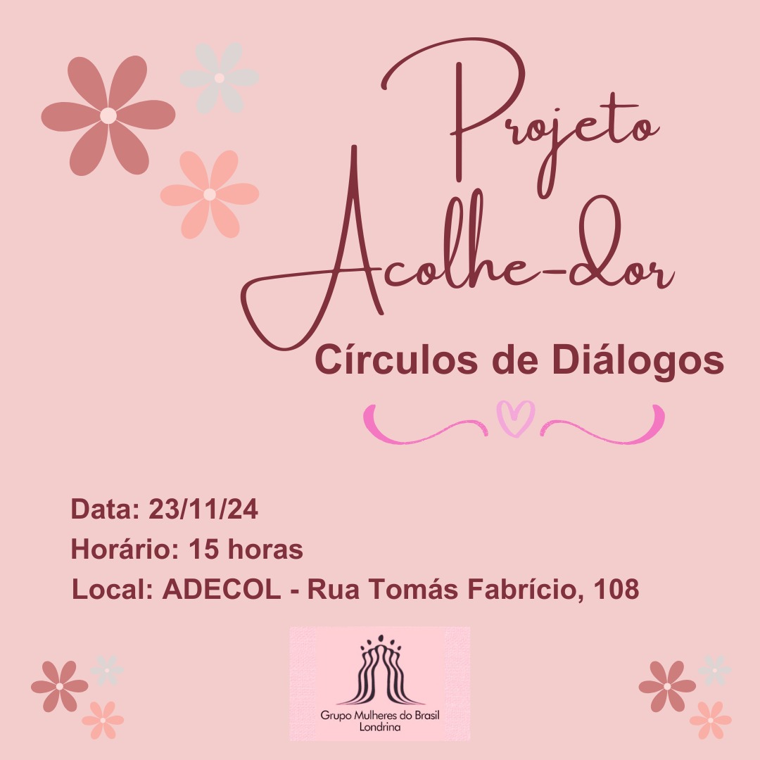 ![]() | Projeto Acolhe-dor Círculo de Diálogo DATA 23 de novembro 24 HORA: 15 h LOCAL: ADECOL Rua Tomás Fabricio 108 Mais informações Cláudia Bilachi WhatsApp 43.9.9138-4438 |