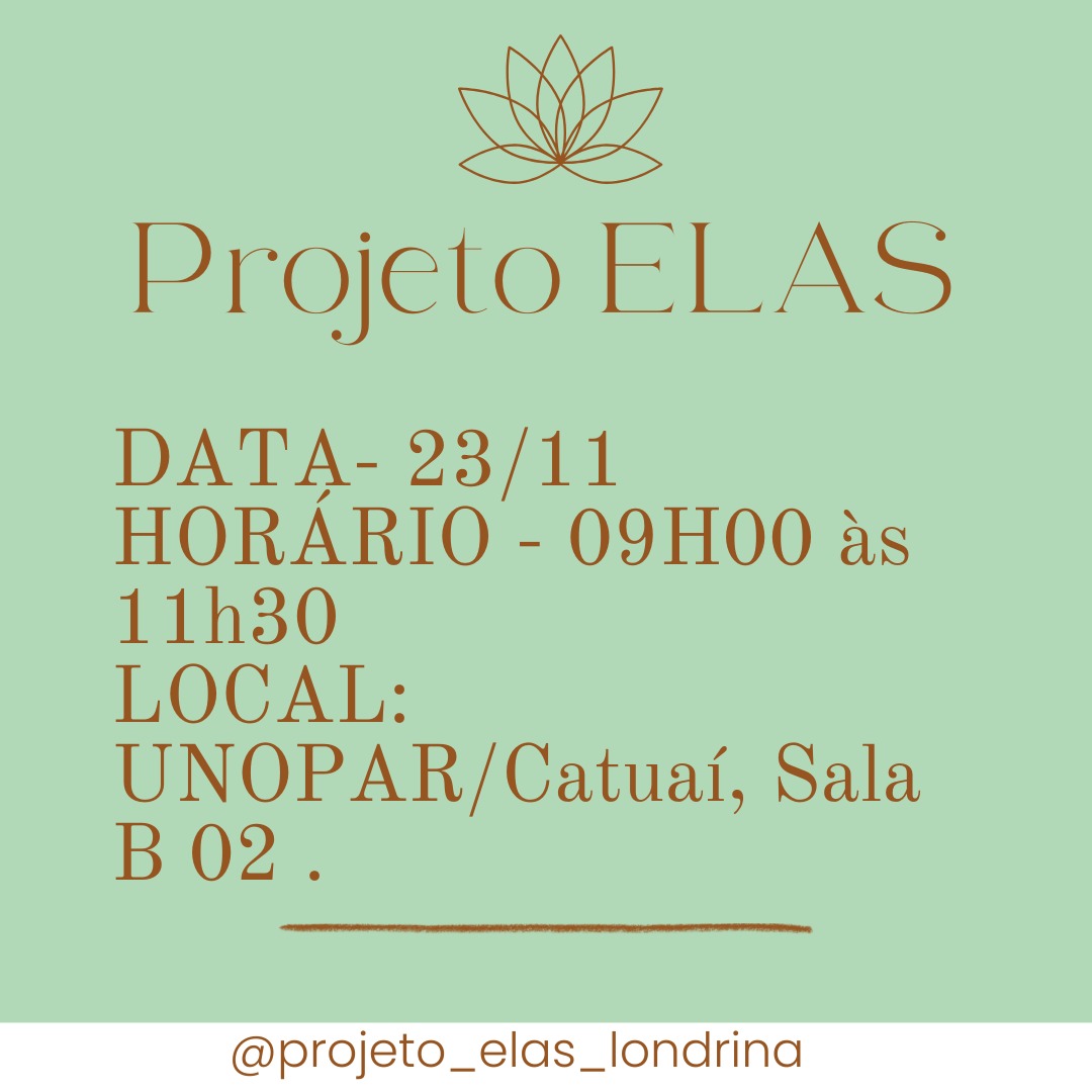 ![]() | Projeto ELAS Data: 23/novembro/2024 Hora: Sábado das 9h -11:30h Local: Unopar Catuai sala B 02 EVENTO ABERTO – Aguardamos voce! 💛 @projeto-elas-londrina Inscrições https://forms.gle/UpR7DupMwu6NGQCg7 |